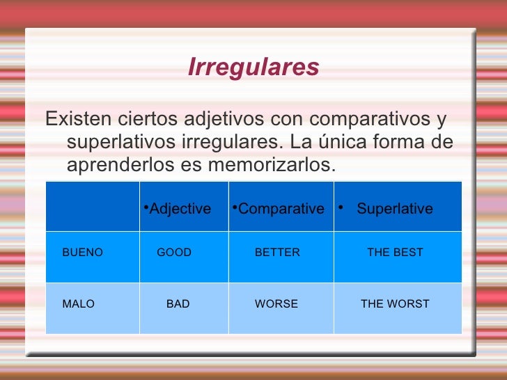 El resto de adjetivos de dos sílabas y todos los de tres o más forman el comparativo con more y el superlativo con most. interesting, more interesting, the most interesting / interesante. COMPARATIVOS Y SUPERLATIVOS IRREGULARES. Algunos adjetivos forman el comparativo de manera irregular. good, better, the best / bueno, mejor, el mejor